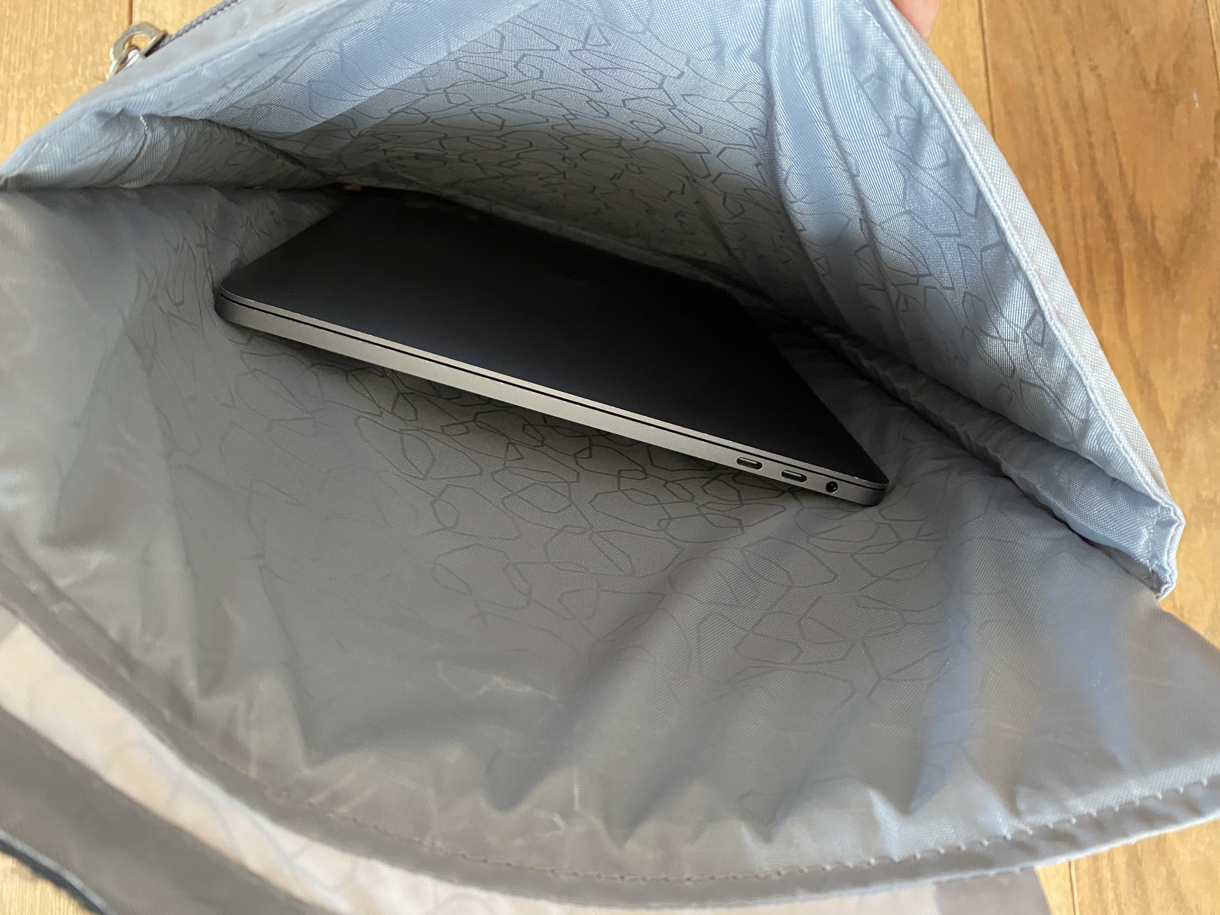 la Pochette à PC est en fait assez large et mon PC de 14 " rentre facile . le systeme de scratch est ingenieux : on peut retirer la pochette si necessaire pour gagner de la place ou la nettoyer sans galérer pour la remettre.